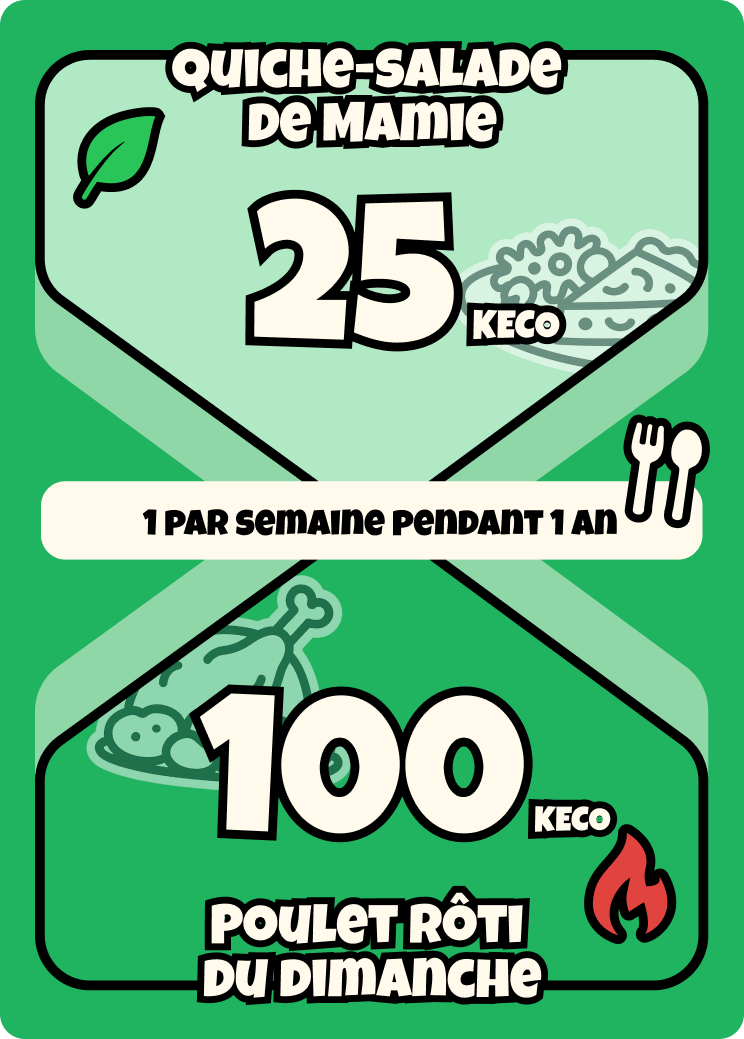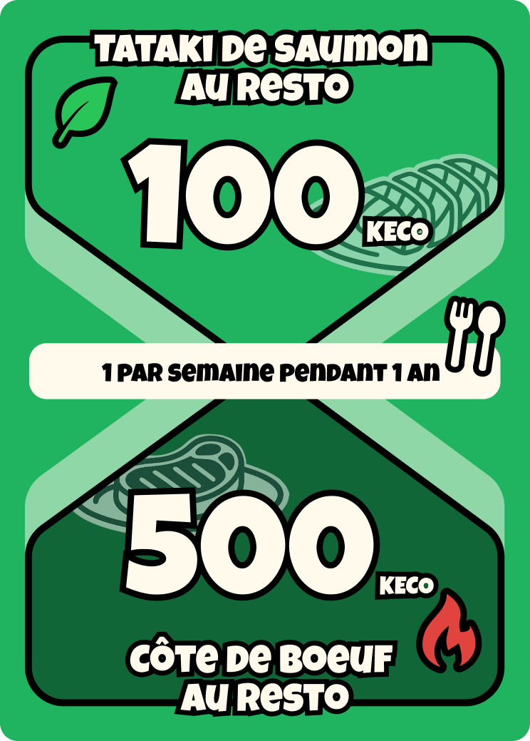 Dès qu'on parle de boeuf, la différence s'agrandit : on considère un burger (270g) au boeuf, soit 5 kg CO₂ eq, donc 264 dans notre cas (5 x 52), qui a été arrondi à 250 KECO.
