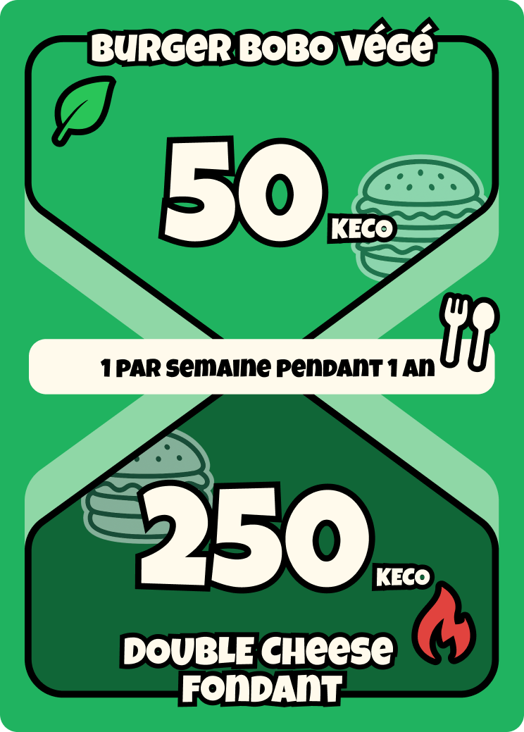 L'ADEME indique 0.73 kg CO₂ eq pour un burger végétarien (270g), donc 38 dans notre cas (0.73 x 52). Qu'on a arrondi à 50 KECO.